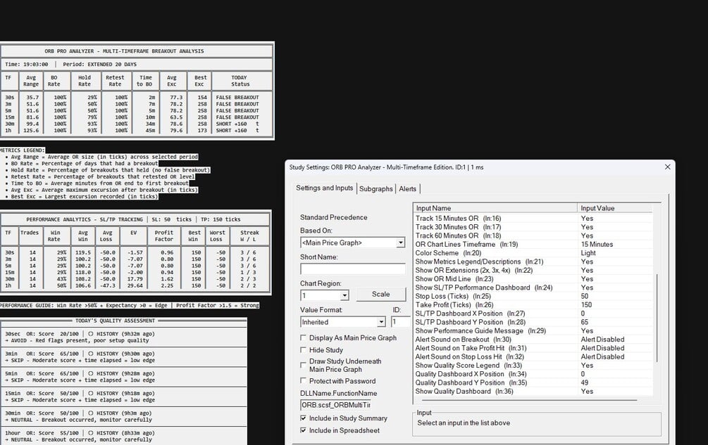 Master the Opening Range Breakout strategy across multiple timeframes simultaneously with ORB PRO Analyzer Multi-Timeframe Edition, a professional-grade Sierra Chart ACSIL study designed for traders seeking high-probability breakout setups, comprehensive performance tracking, and intelligent quality scoring for every OR period.