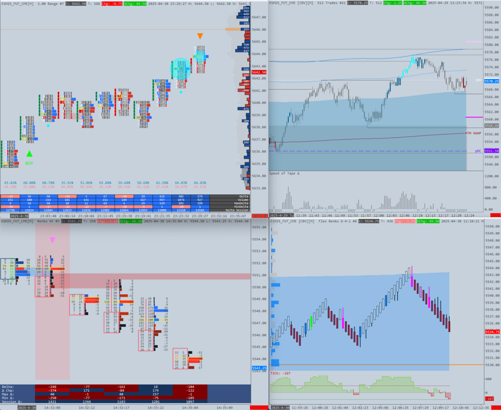 📈 2 x Footprint Charts – Renko & Range styles for detailed orderflow analysis. For ES, Range (8R or 10R) and Renko (6 or 8 Renko) are recommended, with 15R also usable depending on the trader’s trading time frame.