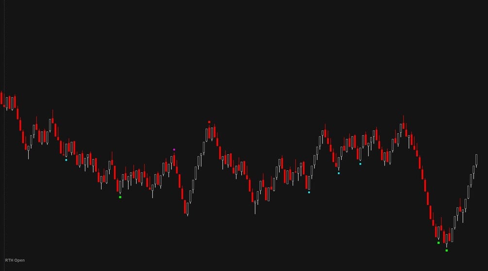 - Identifies exhaustion points where aggressive new highs/lows lose conviction.